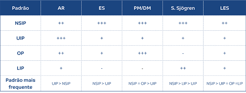 AR: artrite reumatoide; ES: esclerose sistémica; PM/DM: polimiosite/dermatomiosite; LES: lúpus eritematoso sistémico; NSIP: pneumonia intersticial não-específica; UIP: pneumonia intersticial usual; OP: pneumonia organizativa; LIP: pneumonia intersticial linfocítica. Adaptado de Ahuja J, et al. 2016.19