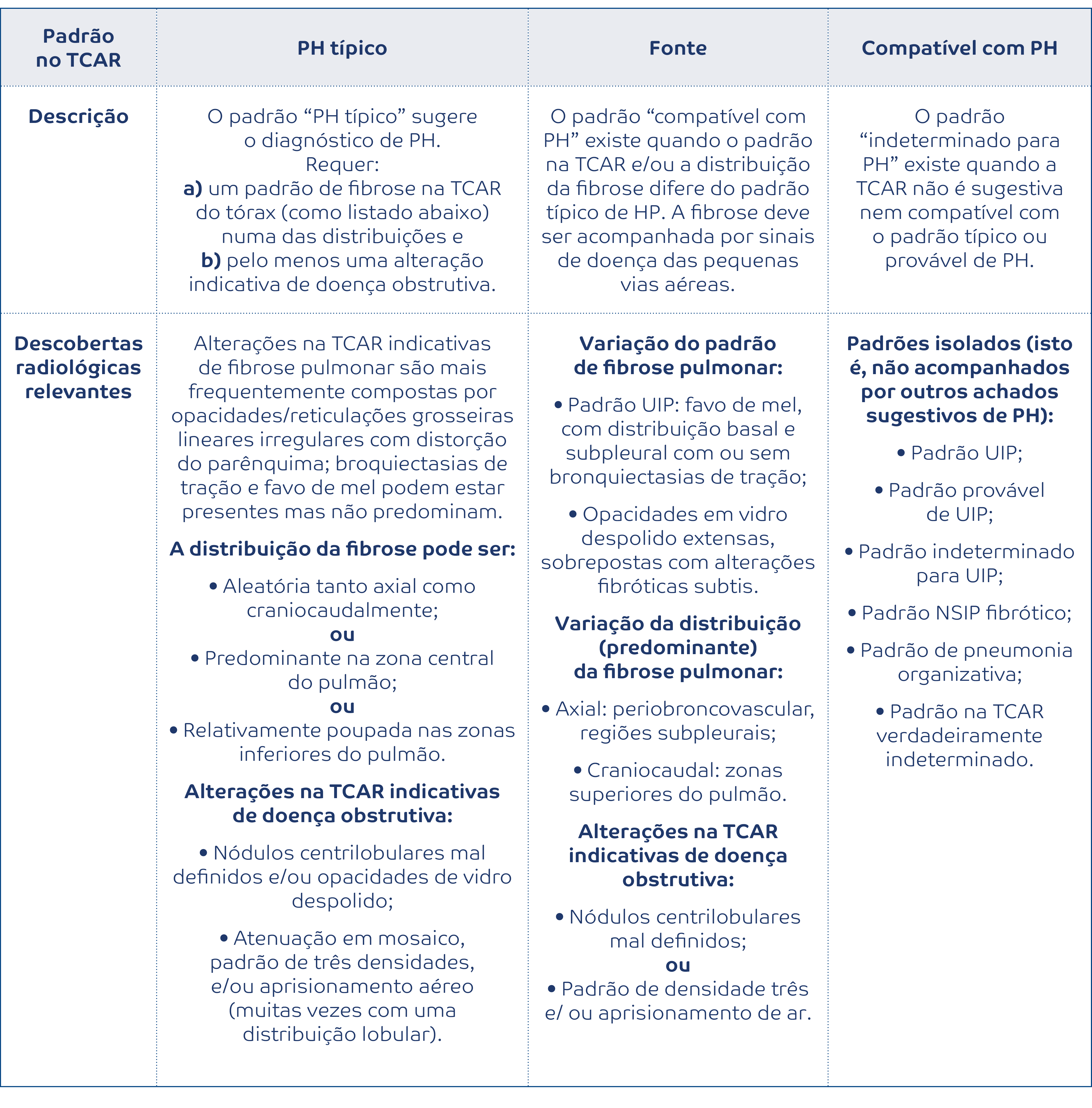 Os achados fibróticos na PH traduzem-se, na maioria das vezes, por um padrão reticular irregular com distorção arquitetural de distribuição difusa quer no plano axial quer no plano craniocaudal.6,20 A broncocentricidade dos achados fibróticos é também uma caraterística desta doença. A presença de bronquiectasias de tração ou de padrão “em favo de mel” é frequente, mas geralmente não constitui o padrão dominante. Um sinal imagiológico tido como específico de PH fibrótica é o “padrão das três densidades” (previamente chamado de padrão headcheese). Este sinal retrata a presença simultânea de três densidades pulmonares diferentes, coexistindo: (a) opacidades em vidro despolido (representando um processo inflamatório ou “infiltrativo”) e um padrão de atenuação em mosaico, constituído por (b) pulmão “normal” (de densidade intermédia), e (c) áreas lobulares de retenção aérea (de baixa densidade), traduzindo o processo obstrutivo das pequenas vias aéreas.6 Por último, salienta-se que, em alguns casos, a apresentação imagiológica pode ser virtualmente indistinguível da fibrose pulmonar idiopática (padrão de “UIP típica” ou “UIP provável”), da NSIP idiopática ou de uma DTC com atingimento pulmonar.