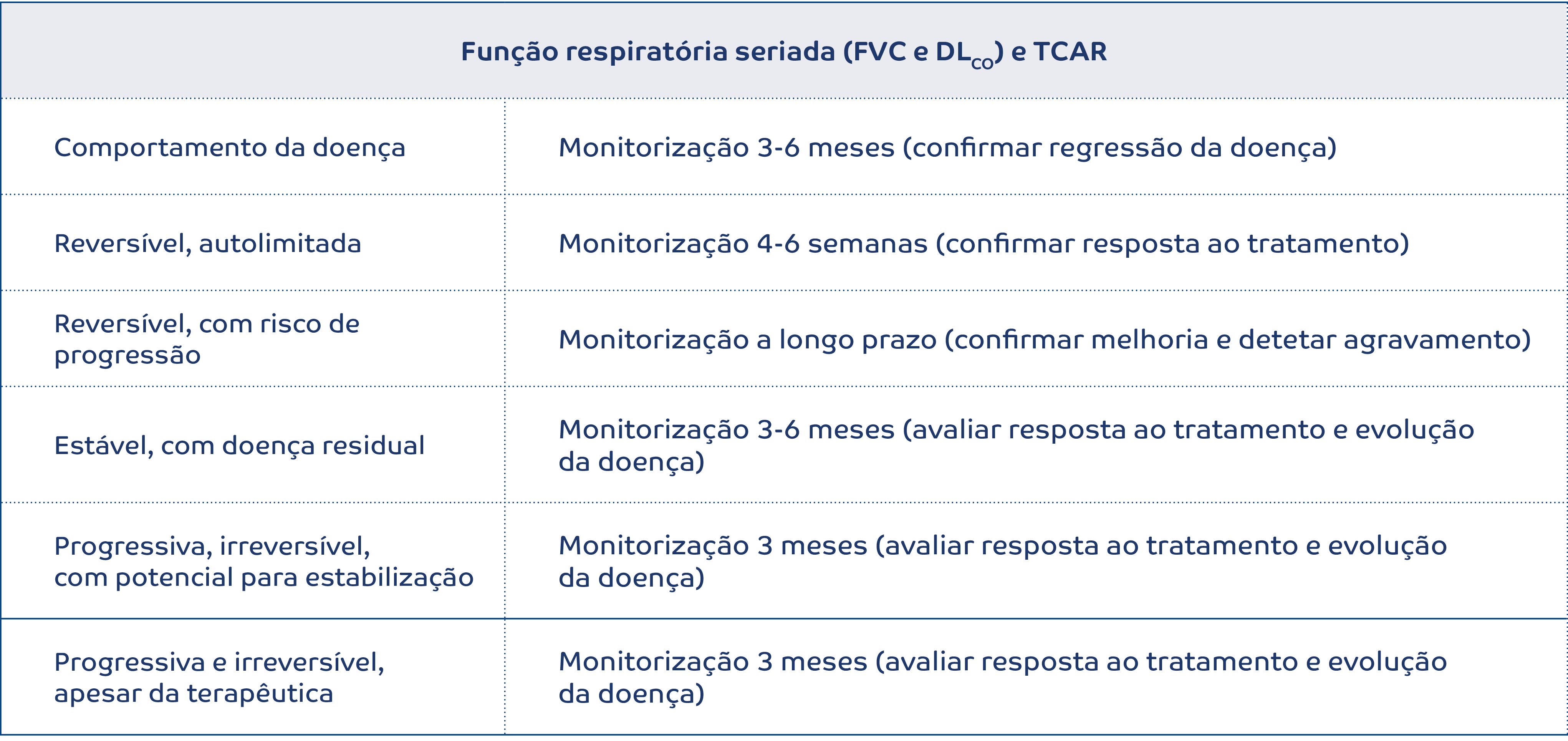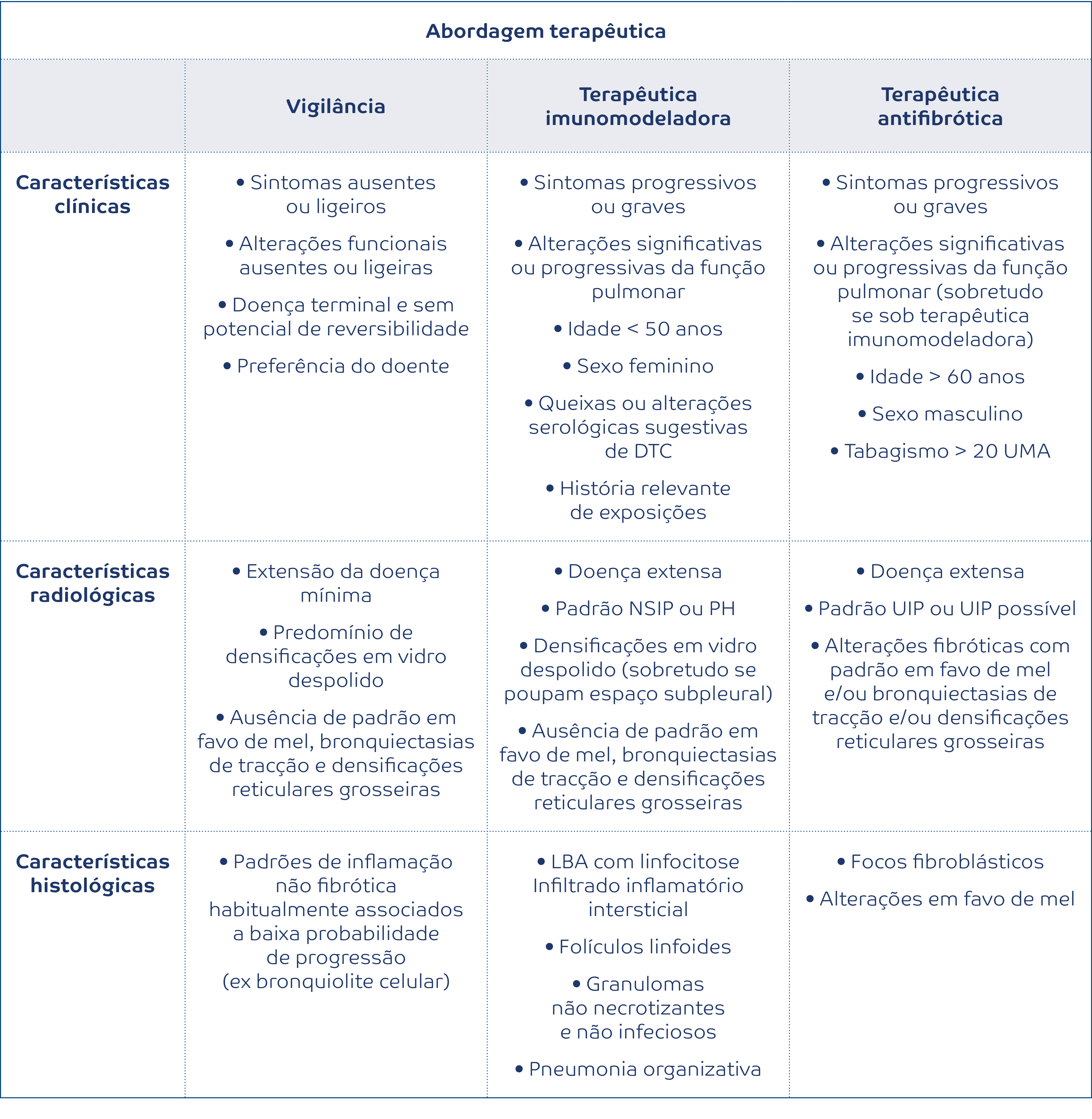 Um dos aspetos mais característicos das DPI é a importante variabilidade do seu comportamento evolutivo, com ou sem tratamento. Algumas destas doenças são exclusivamente inflamatórias, mas a maioria pode cursar com fibrose pulmonar, definida como uma desorganização arquitetural irreversível do parênquima pulmonar. Quando o processo de fibrose ocorre e progride apesar do tratamento adequado, podemos classificá-la como doença fibrosante progressiva. O con-ceito deriva de uma classificação alternativa das doenças de acordo com o seu comportamento clínico, inicialmente proposta por Athol Wells em 2003 e integrada na classificação das pneumonias intersticiais idiopáticas em 2013.2 Esta classificação do comportamento é utilizada para eleger a melhor estratégia de monitorização e tratamento de uma forma quase independente do diagnóstico específico. Na tabela 1, podemos encontrar a classificação de comportamento de doença publicada na classificação internacional das pneumonias intersticiais idiopáticas de 2013.