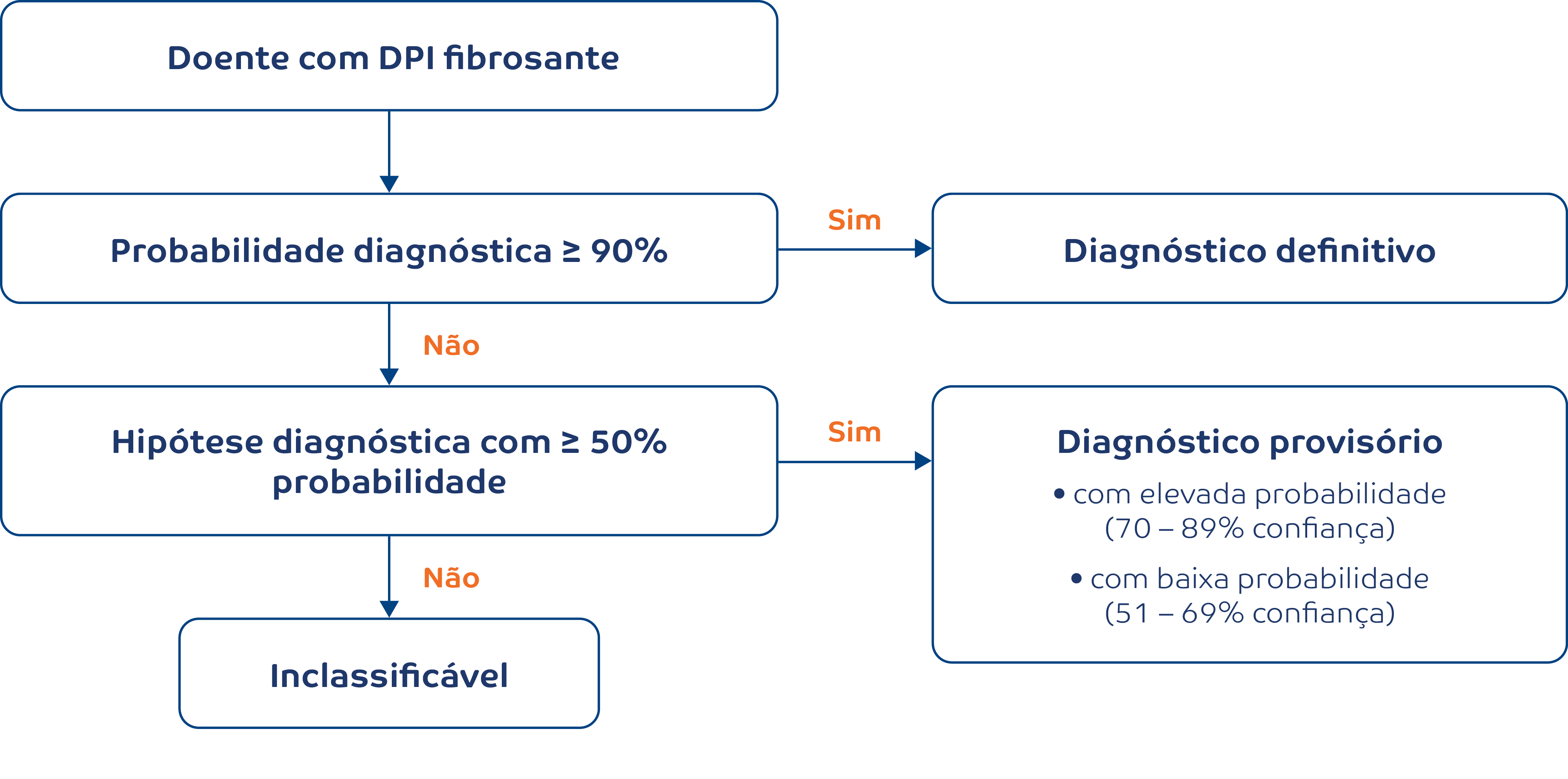 Mais recentemente foi proposto um algoritmo diagnóstico, no qual, após integração da informação clínica, laboratorial (incluído estudo marcadores serológicos de autoimunidade), radiológica e histológica, se atribui um grau de probabilidade / confiança ao diagnóstico, denominando-se de inclassificável as situações em que o grau de confiança no diagnóstico é inferior a 50%.4